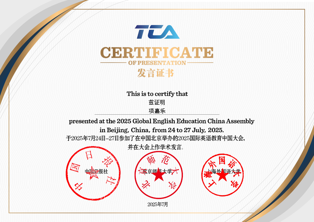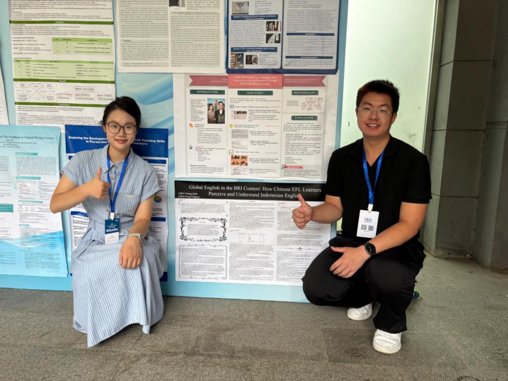 项嘉乐同学表示,“第一次接触学术海报是在谢涵老师的英语课上,学术海报展是考核项目之一。通过课程学习,我锻炼了自己在学术应用场景中的跨文化交际能力,为本次参会打下了坚实基础。课程结束后,我们在谢涵老师的指导下不断打磨研究方案,并获得了国家大创项目的立项。经过为期三个月的数据收集、分析,我们尝试投稿,有幸入围了TESOL大会。”