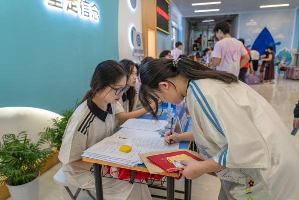 助教与团学干部们耐心指引报到流程:从信息核验到领取校园卡,每一步都细致周到,用行动传递着学长学姐的温暖。