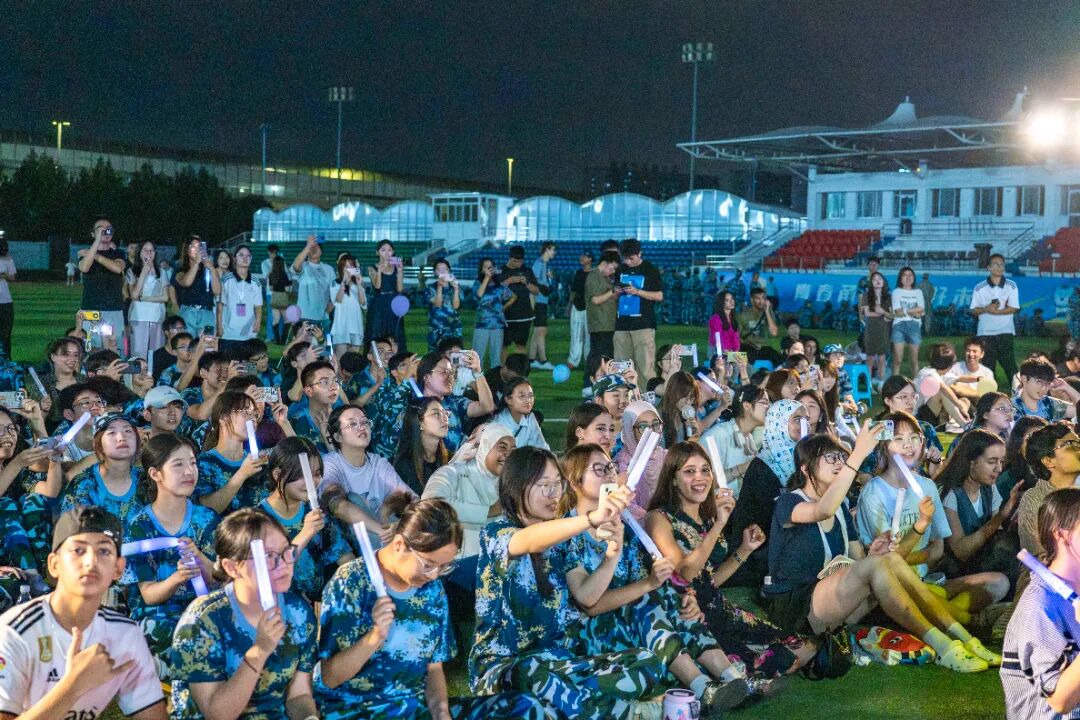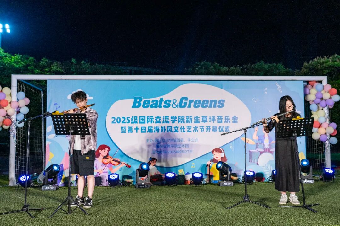 初秋的风裹挟着桂花的甜香,吹拂过校园操场足球场北侧。9 月 27 日,“Beats&Greens”2025 级国际交流学院新生草坪音乐会暨第十四届海外风文化艺术节在这里浪漫开演。参与这场盛会的有国际交流学院党委书记陈淑娇、党委副书记朱丽萍、辅导员们、英姿飒爽的教官们以及2025 级本科新生,同时也汇聚了来自世界各地国际留学生,不同文化在此碰撞、交融,共谱青春华章。